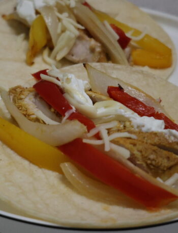 Add shredded cheese and chicken to top of tortilla. (Optional: add diced red onion or spinach)